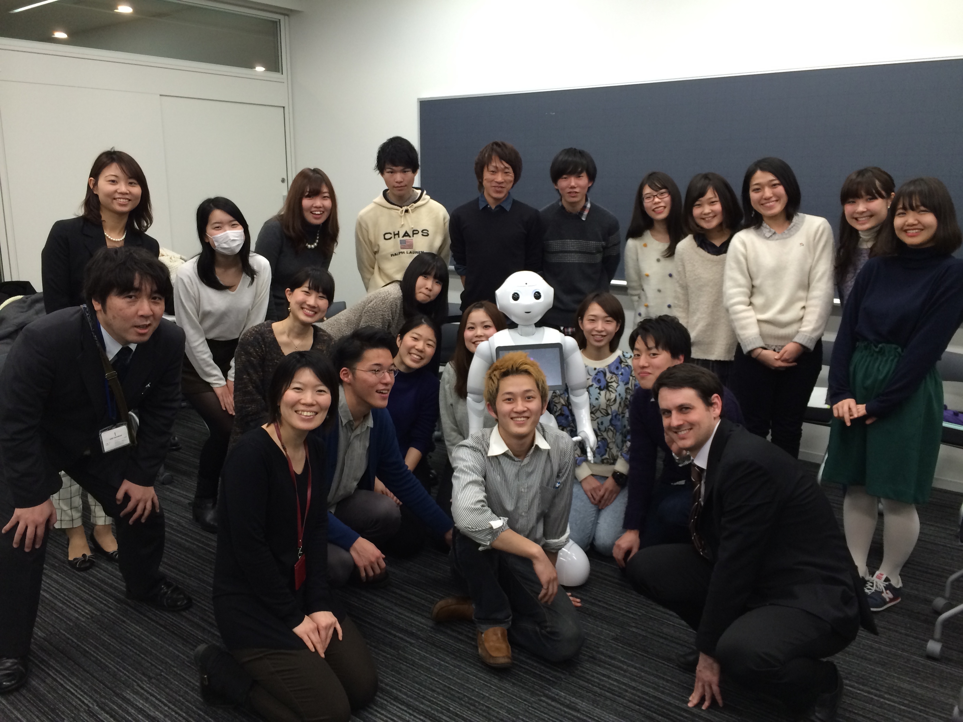 第15回授業 pepperとの交流 2015年2月27日2015年12月18日 授業最終日は、アクシスインターナショナル株式会社技術開発本部の伊藤さんと伴さんたちに来ていただき、Pepperとの交流会を持ちました。 前回の授業では、2030年の日本社会での働き方を考えるワークショップをリクルートと連携して実施しましましたが、今回はその具体的なイメージとしてロボットとどのように共生していくことになるか、という寸劇をしました。 受講生の発想はとてもユニークで盛り上がりました。また映像等で紹介したいと思います。
